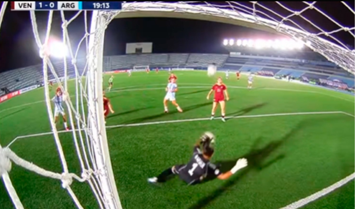 Minuto 41. De tiro libre, Sofía Domínguez anota un golazo inatrapable para igualar el marcador. ARG 1-1 VEN. Video: DSports