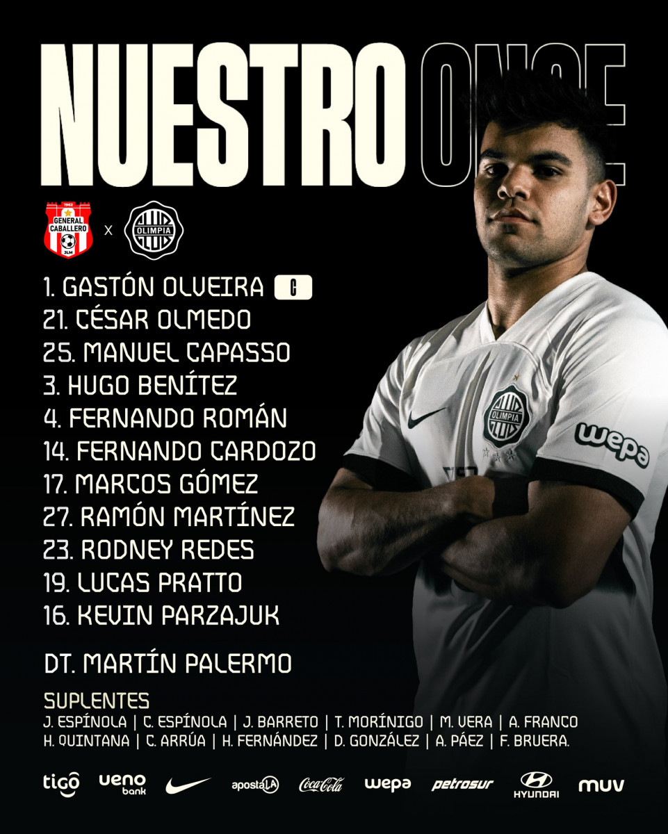 - Olimpia: Olveira, Zabala, Salcedo, Capasso, Olmedo, Arrúa, Cardozo, Gómez, Redes, Páez, Pratto.