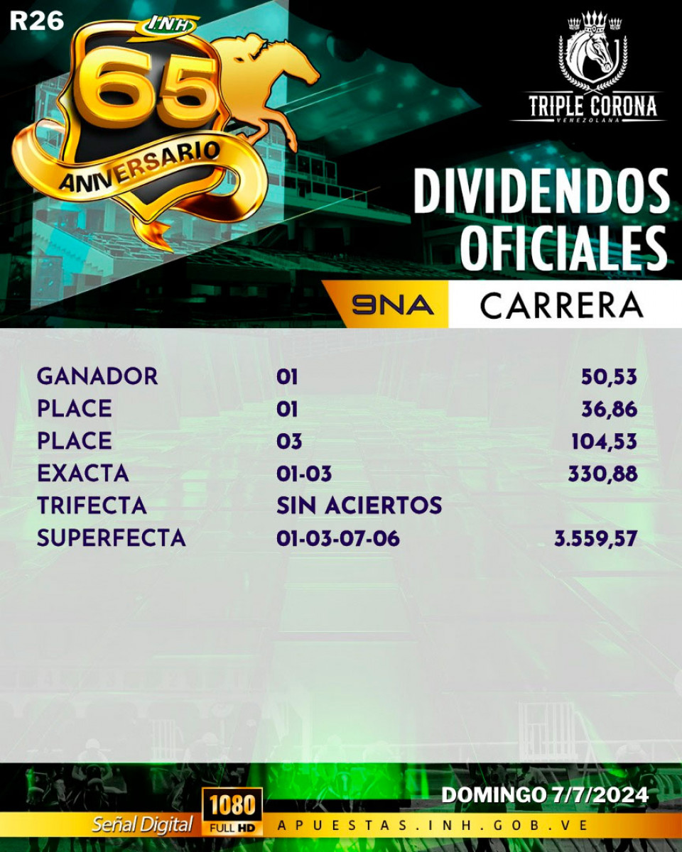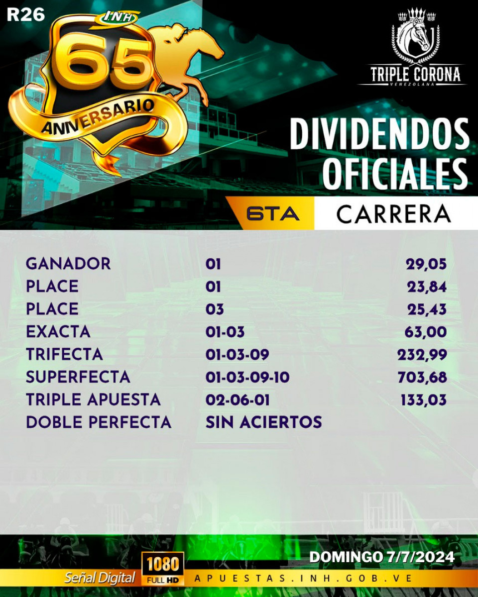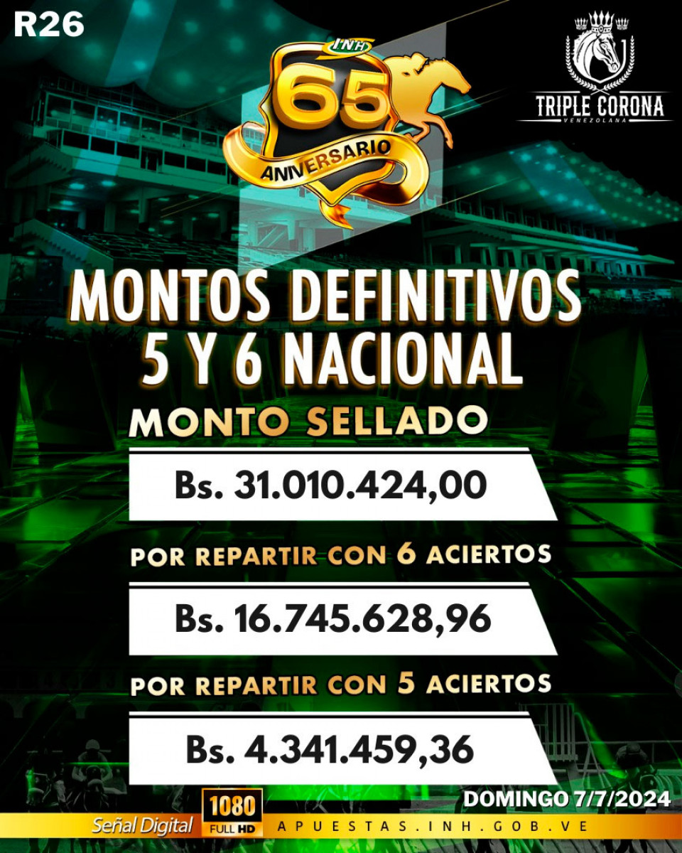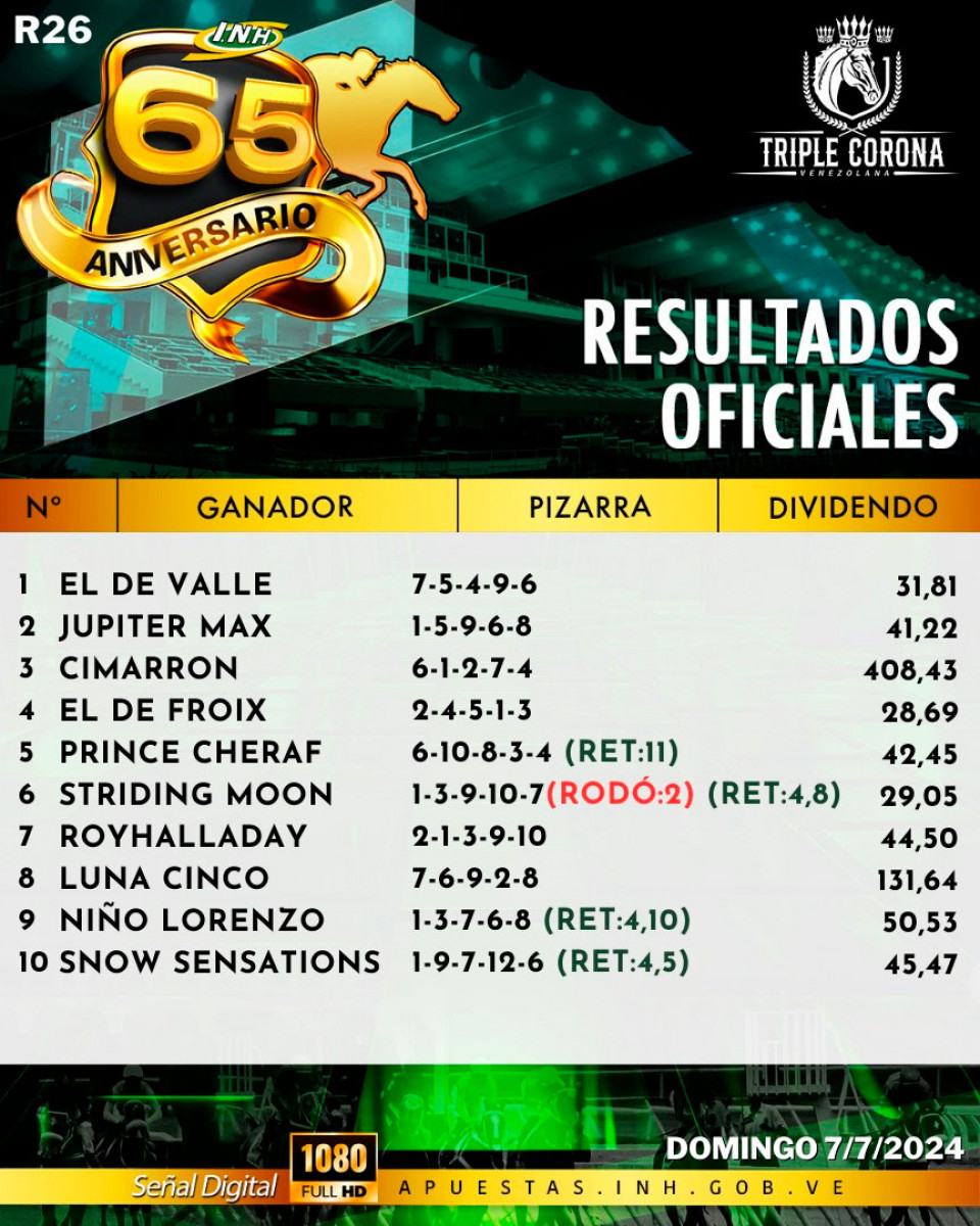 El Hipódromo La Rinconada celebró otra edición del 5y6 hoy, 7 de julio. Las seis carreras válidas del día ya se disputaron, con triunfo de varios favoritos, y el monto sellado superó los 31 millones de bolívares. Aunque no hubo ganador de un cuadro único con seis aciertos, las recompensas para los apostadores afortunados siguen siendo bastante altas. Liga tu jugada con nosotros y entérate qué tal les fue con sus pronósticos a los expertos y retrospectos hípicos.