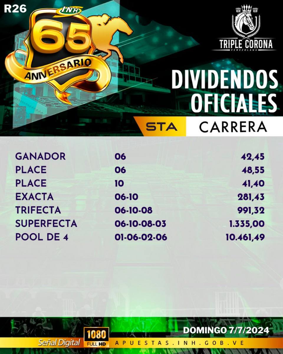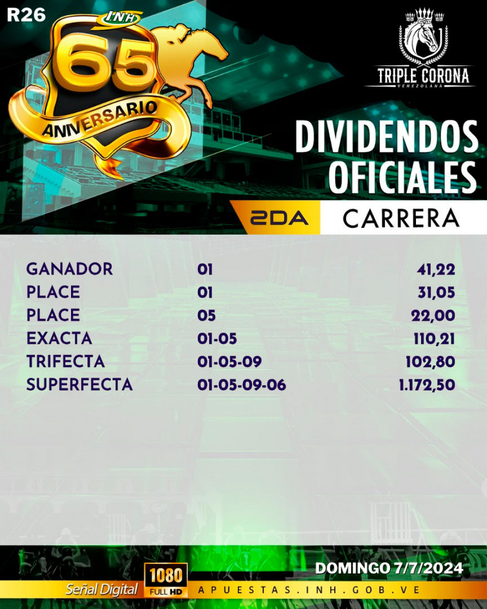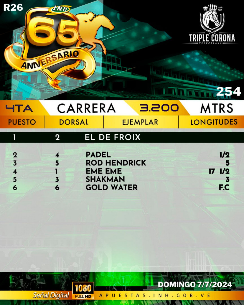 El Hipódromo La Rinconada celebró otra edición del 5y6 hoy, 7 de julio. Las seis carreras válidas del día ya se disputaron, con triunfo de varios favoritos, y el monto sellado superó los 31 millones de bolívares. Aunque no hubo ganador de un cuadro único con seis aciertos, las recompensas para los apostadores afortunados siguen siendo bastante altas. Liga tu jugada con nosotros y entérate qué tal les fue con sus pronósticos a los expertos y retrospectos hípicos.