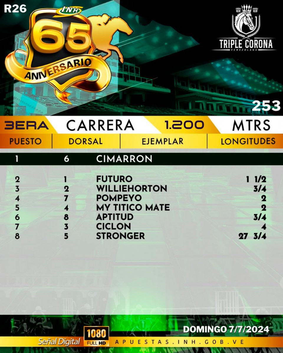 Con una espectacular atropellada por fuera en los últimos 100 metros, Cimarrón (6) se llevó la tercera carrera del día, con la monta de Jean Carlos Rodríguez y el entrenamiento de Eliecer Gómez. Foto: INH