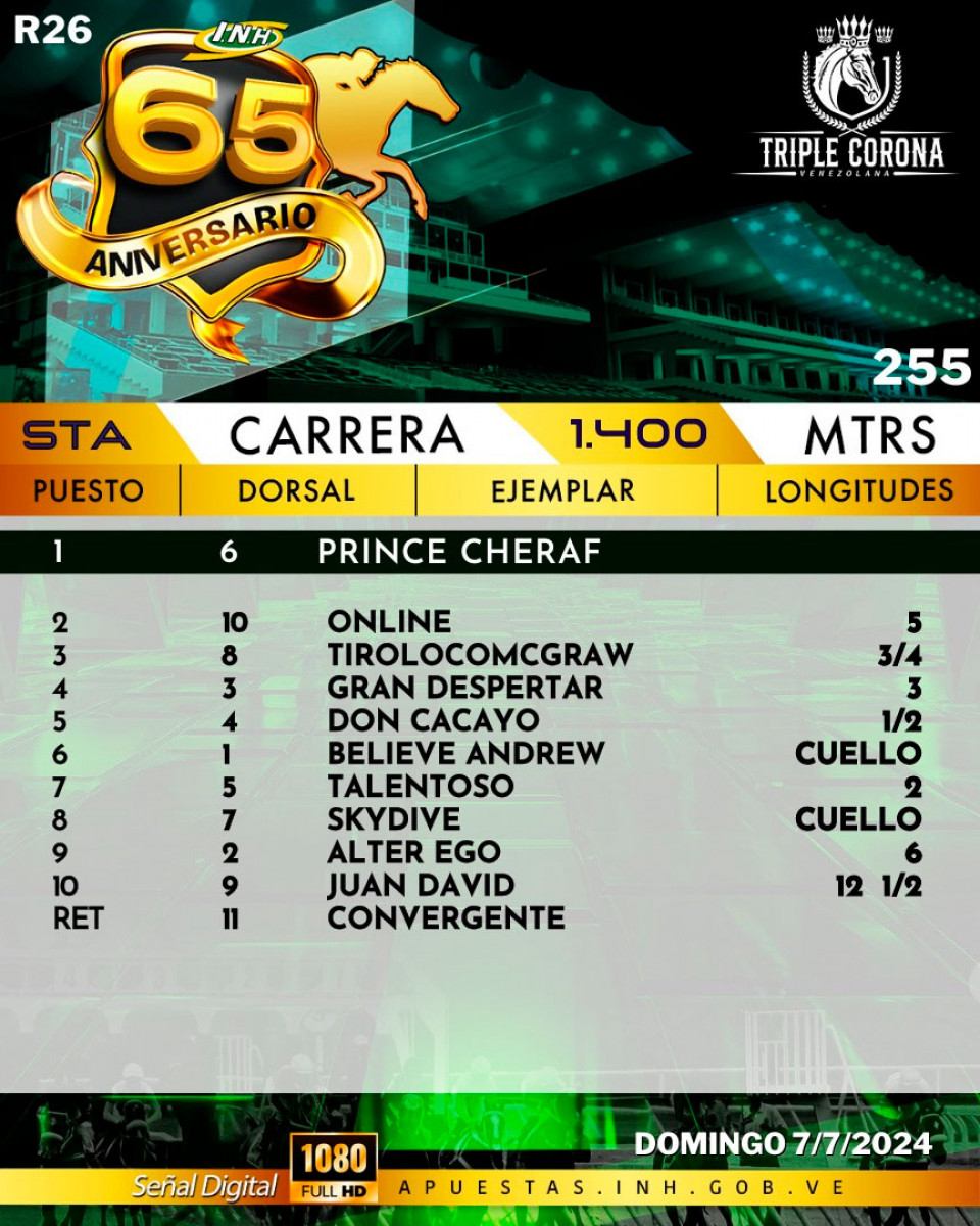 Prince Cheraf (6) entró con todo en el inicio de la recta final y sobrepasó al líder para quedarse con la primera válida del 5y6, con la monta de Álvaro Finol y la preparación de Luis Peraza. Foto: INH
