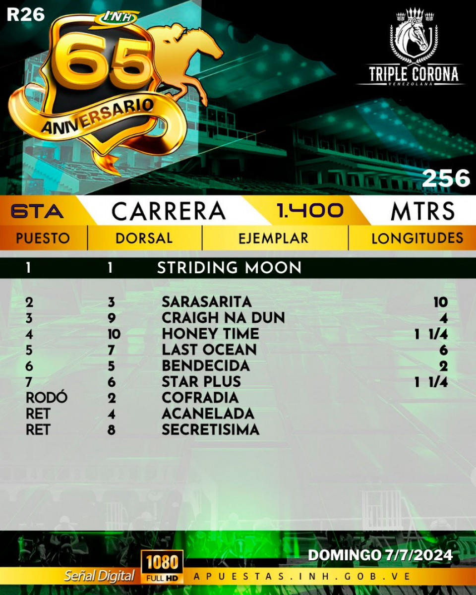 Luego de tomar la punta tras los primeros 100 metros y resistir el acecho rival, Striding Moon (1) se disparó con todo en la recta final y venció con más de seis cuerpos de ventaja. Ganaron el jinete Maykor Ibarra y el entrenador Dotwing Fernández. Foto: INH