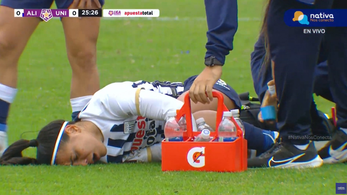 Rafinha Marques se encuentra llorando por una fuerte entrada de la jugadora de Universitario de Deportes. La jugadora blanquiazul está siendo atendida por los médicos.