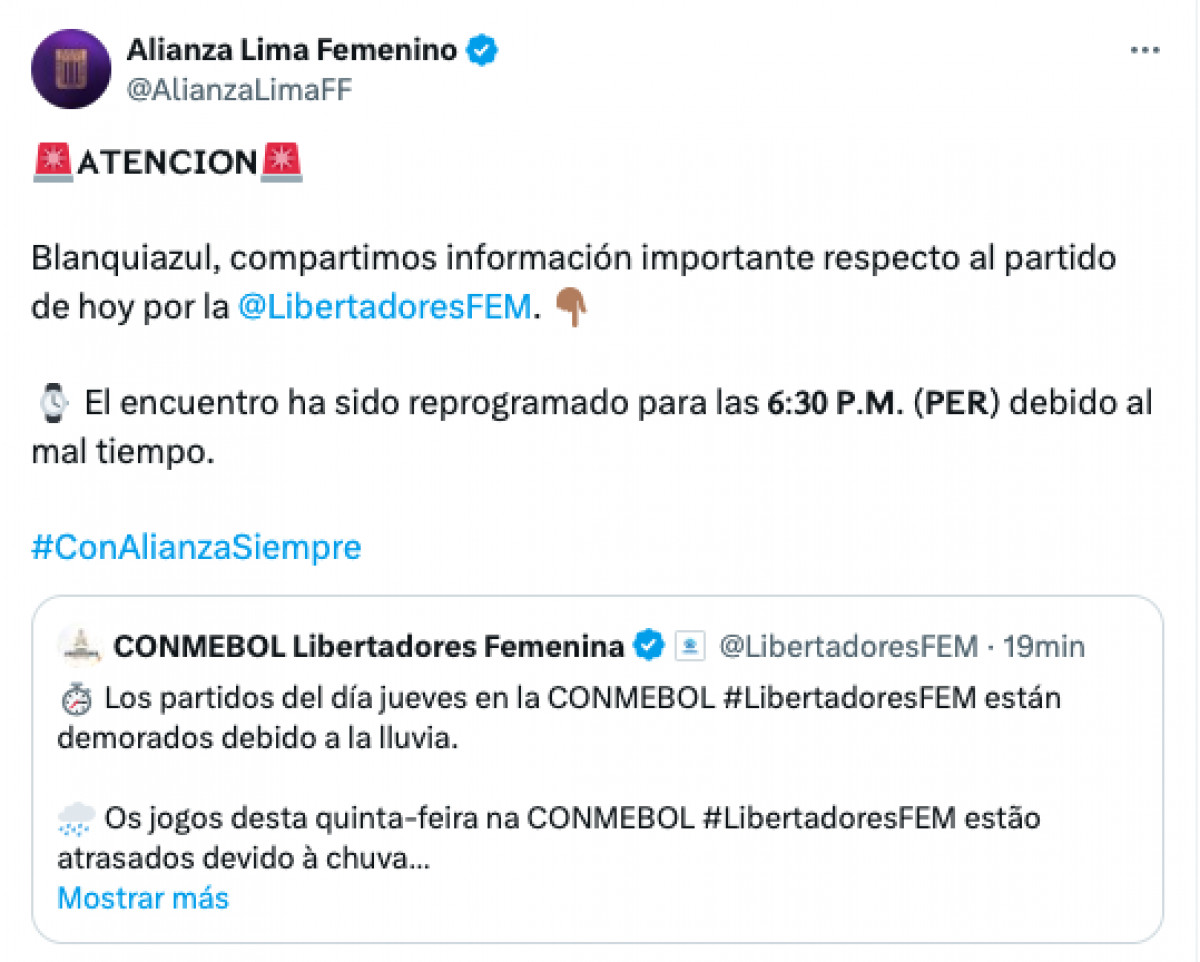 A través de sus redes sociales, el club blanquiazul anunció que es partido se retrasará 30 minutos debido al mal clima; por ello, el duelo ante Guaraní empezará a partir de las 6.30 p. m. (hora peruana) y 7.30 p. m. (hora paraguaya).