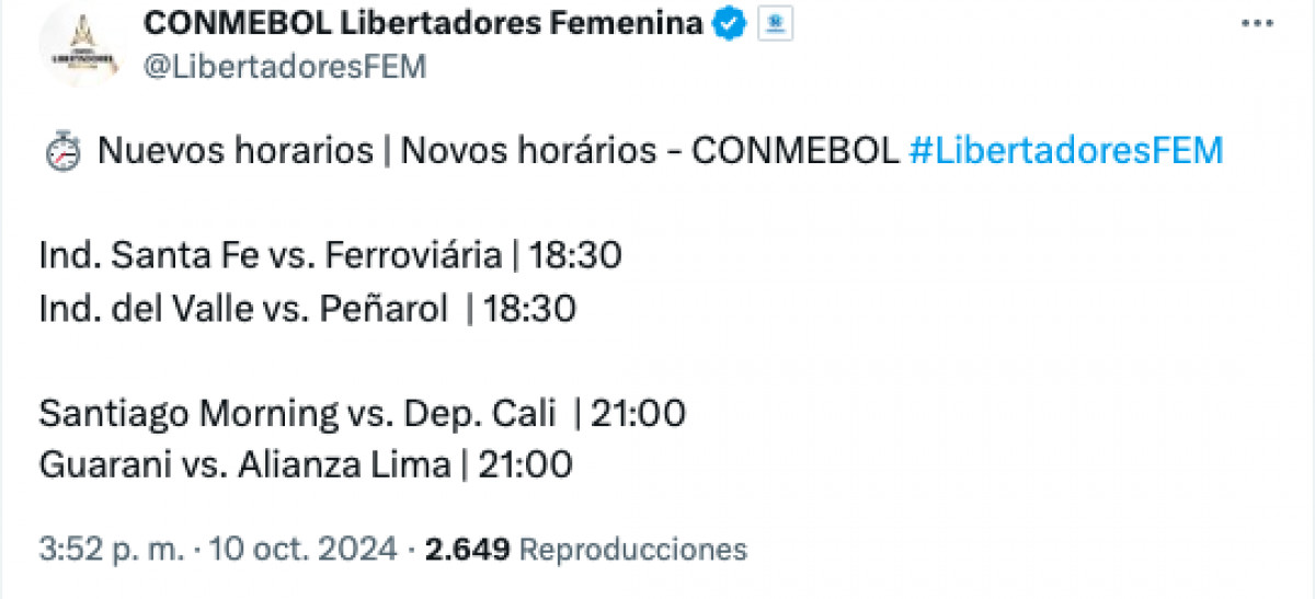 La Conmebol publicó una nueva actualización e informó que el partido Alianza Lima vs. Guaraní se jugará a partir de las 7.00 p. m. (hora peruana) y 8.00 p. m. (hora paraguaya).