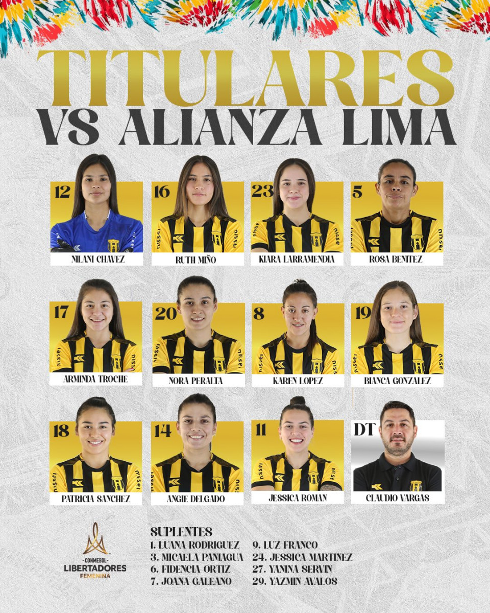 - Defensas: Rosa Castro, Gianella Romero, Yomira Tacilla, Ariane Cabrera, Rayane Rodríguez, Tifani Molina y Neidy Romero.