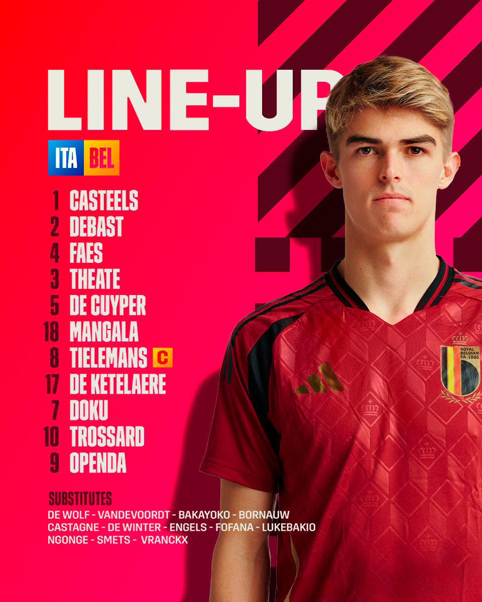 - Bélgica: Koen Casteels; Timothy Castagne, Wout Faes, Zeno Debast, Arthur Theate; Orel Mangala, Youri Tielemans, Dodi Lukebakio, Jérémy Doku, Leandro Trossard; Loïs Openda.
