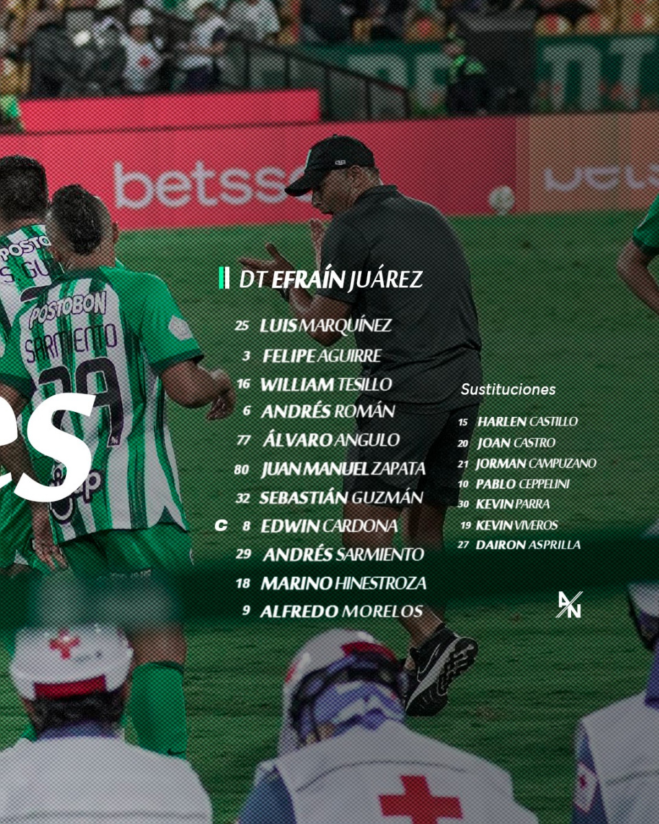 Luis Marquínez, Felipe Aguirre, William Tesillo, Andrés Román, Álvaro Angulo, Juan Manuel Zapata, Sebastián Guzmán, Edwin Cardona, Andrés Sarmiento, Marino Hinestroza, Alfredo Morelos. Foto: X/Atlético Nacional.