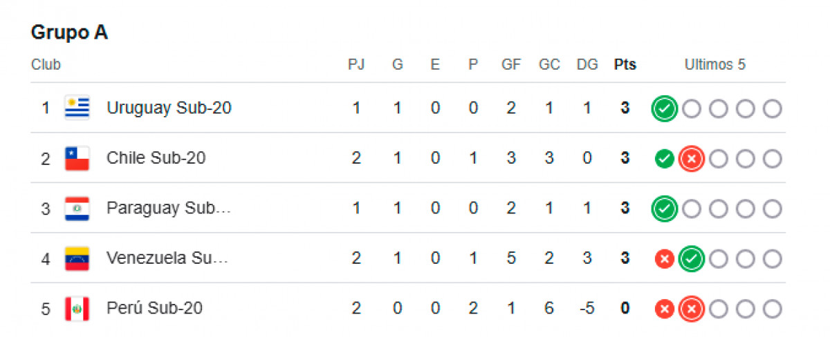 Así marcha la tabla de posiciones del grupo A previo al inicio del partido entre Perú vs. Chile sub-20. Foto: Google.