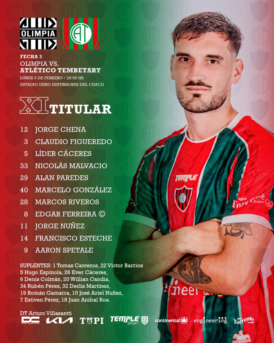 Ghena, Figueredo, Cáceres, Malvacio, Paredes, González, Riveros, Ferreira, Núñez, Esteche, Spetale. Foto: Club Atlético Tembetary