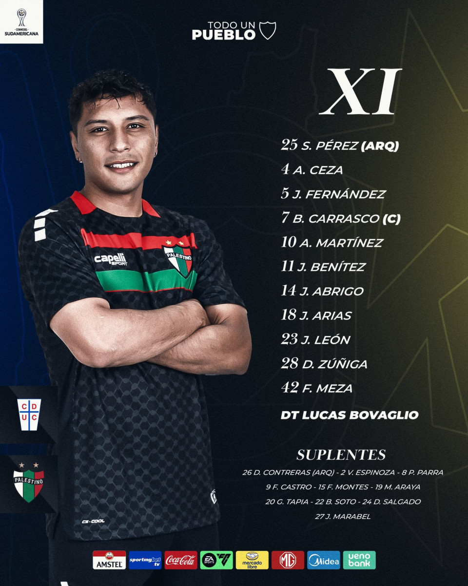 Pérez, Ceza, Fernández, Carras, Martínez, Benítez, Abrigo, Arias, León, Zúñiga y Meza. Foto: X/Palestino.