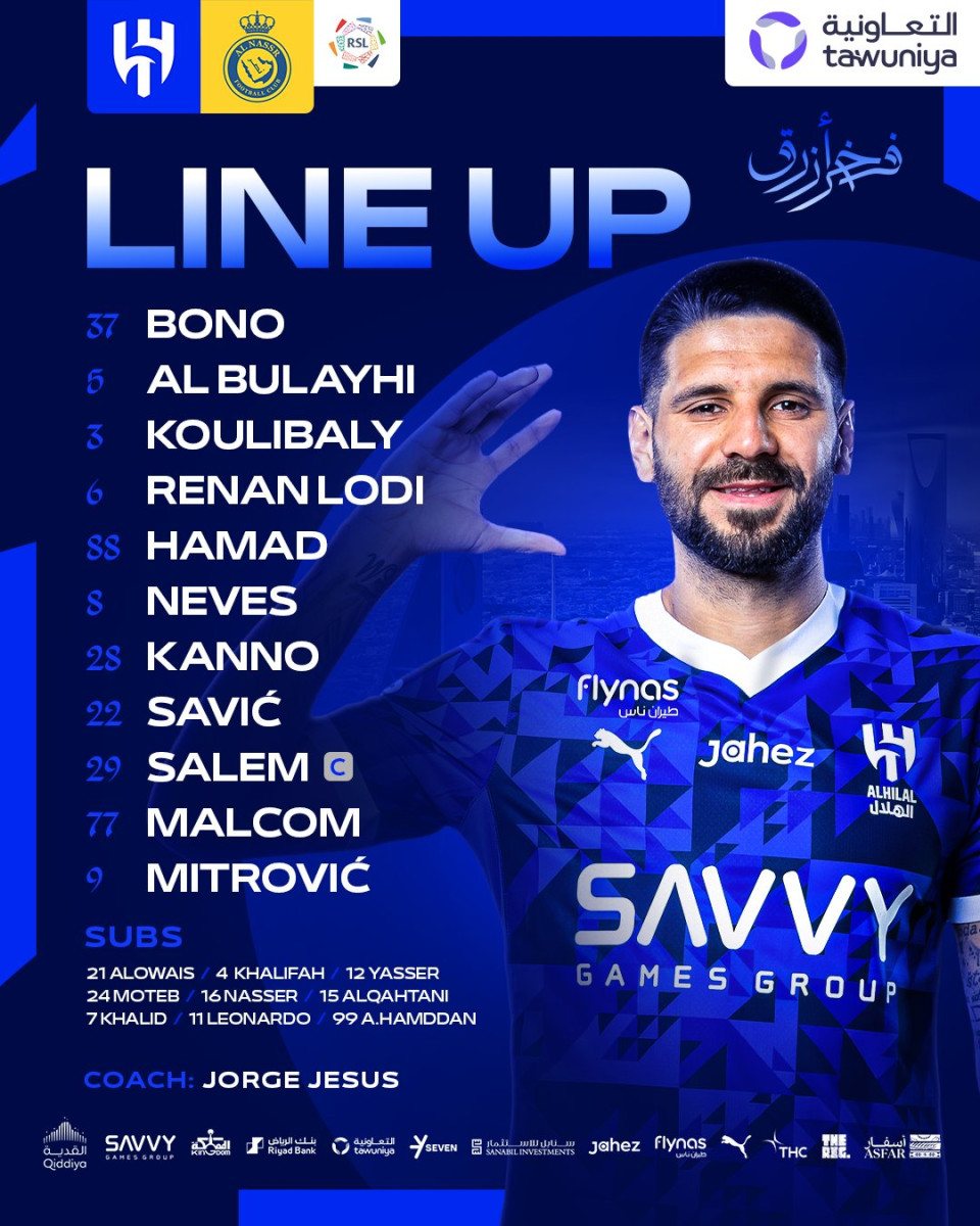 Bono, Al Bulayhi, Koulibaly, Renán Lodi, Hamad, Neves, Kanno, Savic, Salem, Malcom, Mitrovic. Foto: Al Hilal