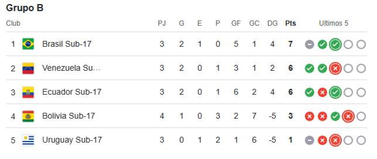 Tabla de posiciones del grupo B del Sudamericano Sub-17. Foto: Google