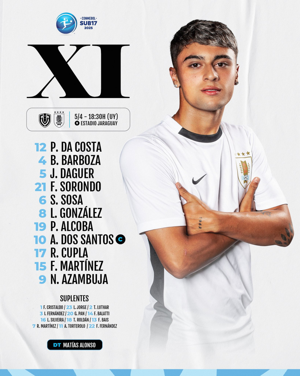 Da Costa, Barboza, Daguer, Sorondo, Sosa, González, Alcoba, Dos Santos (C), Cupla, Martínez y Azambuja. Foto: selección uruguaya