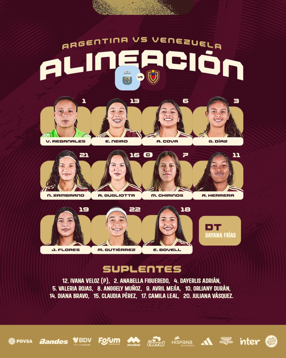 Rebanales, Neiro, Cova, Díaz, Zambrano, Gugliotta, Chirinos, Herrera, Flores, Gutiérrez, Bovell. Foto: Vinotinto Femenina