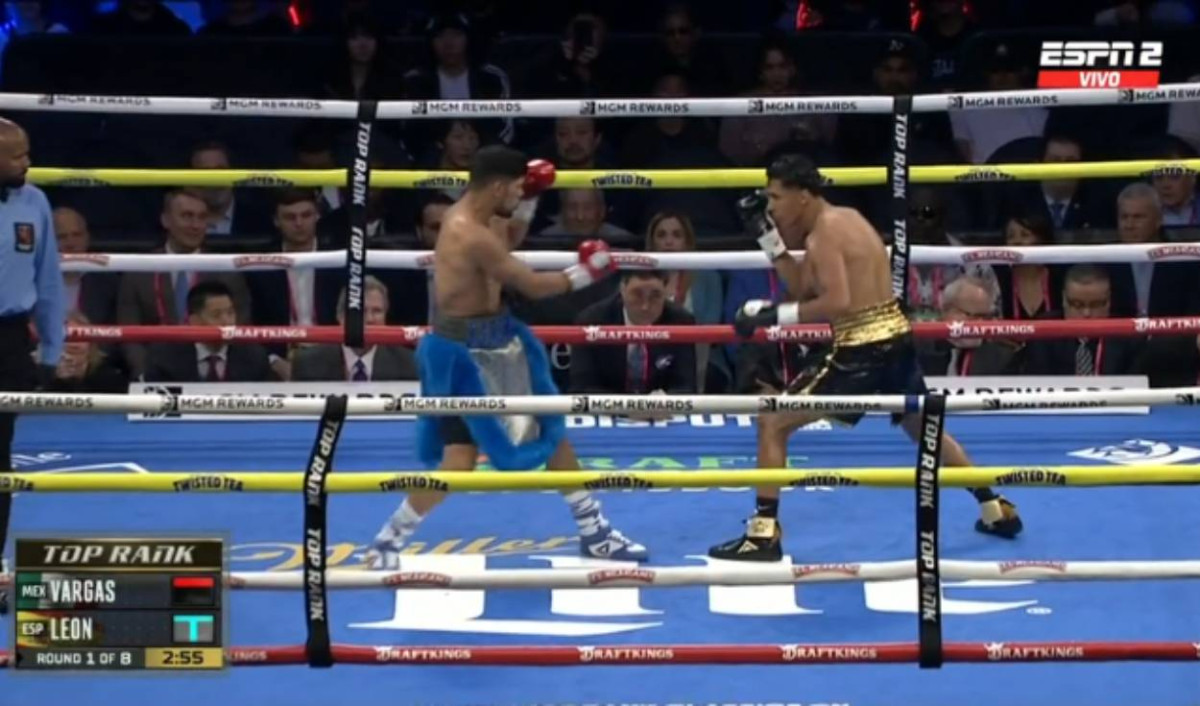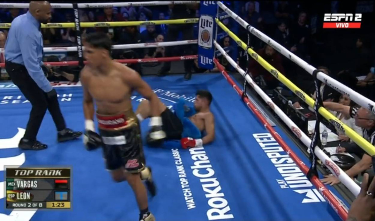 A poco más de un minuto de terminar el segundo round, el mexicano Emiliano Vargas derribó dos veces al español Juan León. La segunda, con un uppercut de izquierda, fue la definitiva. Foto: ESPN