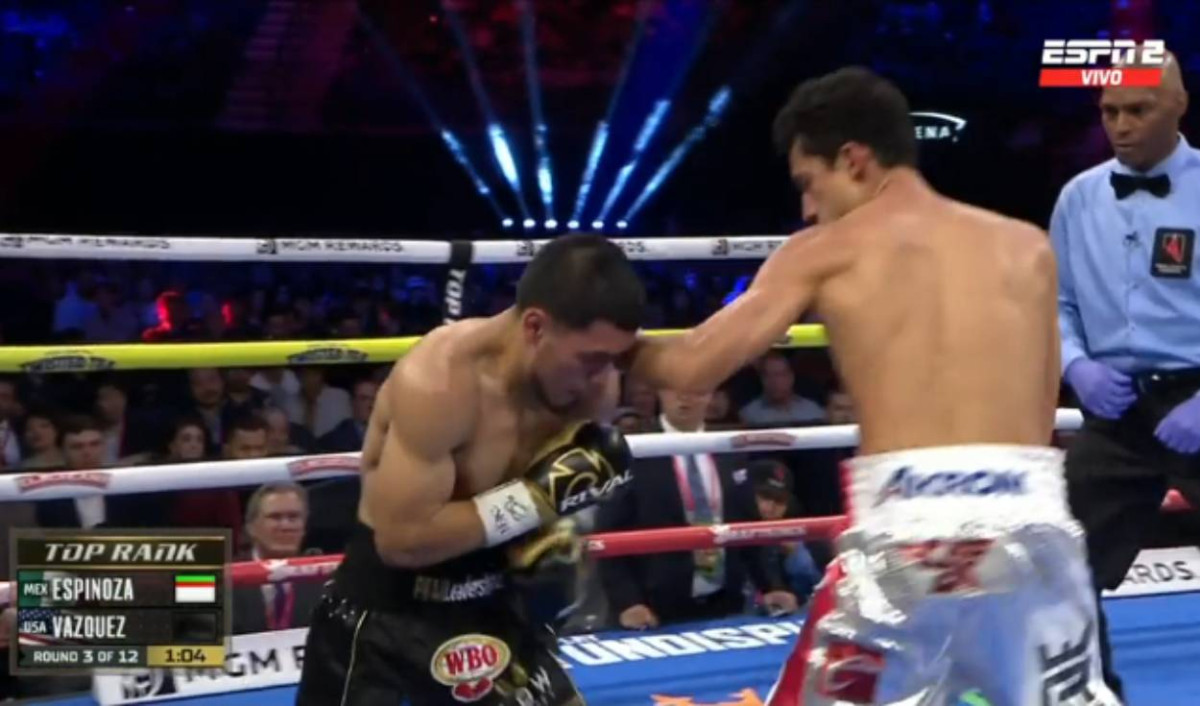 El séptimo round fue el definitivo: con una serie de uppercuts y una combinación feroz de golpes al cuerpo, Espinoza terminó por dejar sin reacción a Vázquez y obligó al réferi a frenar las acciones. Foto: ESPN