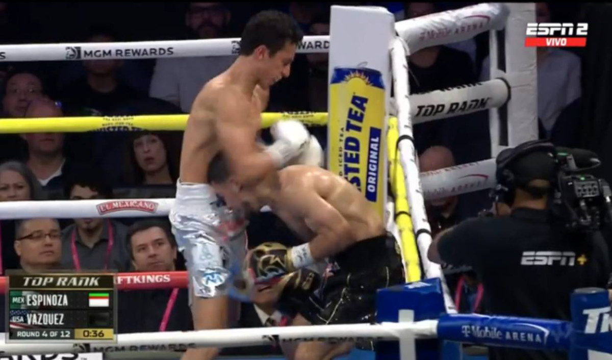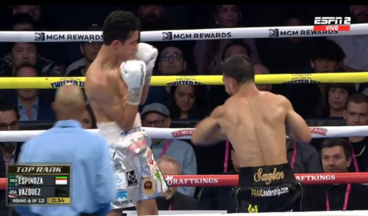 Espinoza ataca a las partes blandas de su rival y saca golpes más duros con el pasar de los minutos. Vázquez llegó a tambalear y a agarrarse de su rival para no caer hacia el final del cuarto round. Foto: ESPN