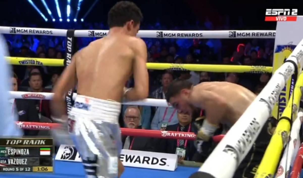 Espinoza llega a poner dos veces contra las cuerdas a Vázquez, quien luce sangrante y fuera de forma en el quinto round. El réferi está atento por si es necesario parar la pelea. Foto: ESPN