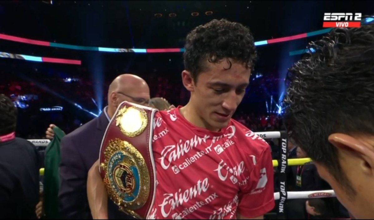 Rafael Espinoza mantiene su récord invicto y luce con orgullo el cinturón pluma OMB. En minutos, Naoya Inoue y Ramón Cárdenas subirán al ring. Foto: ESPN