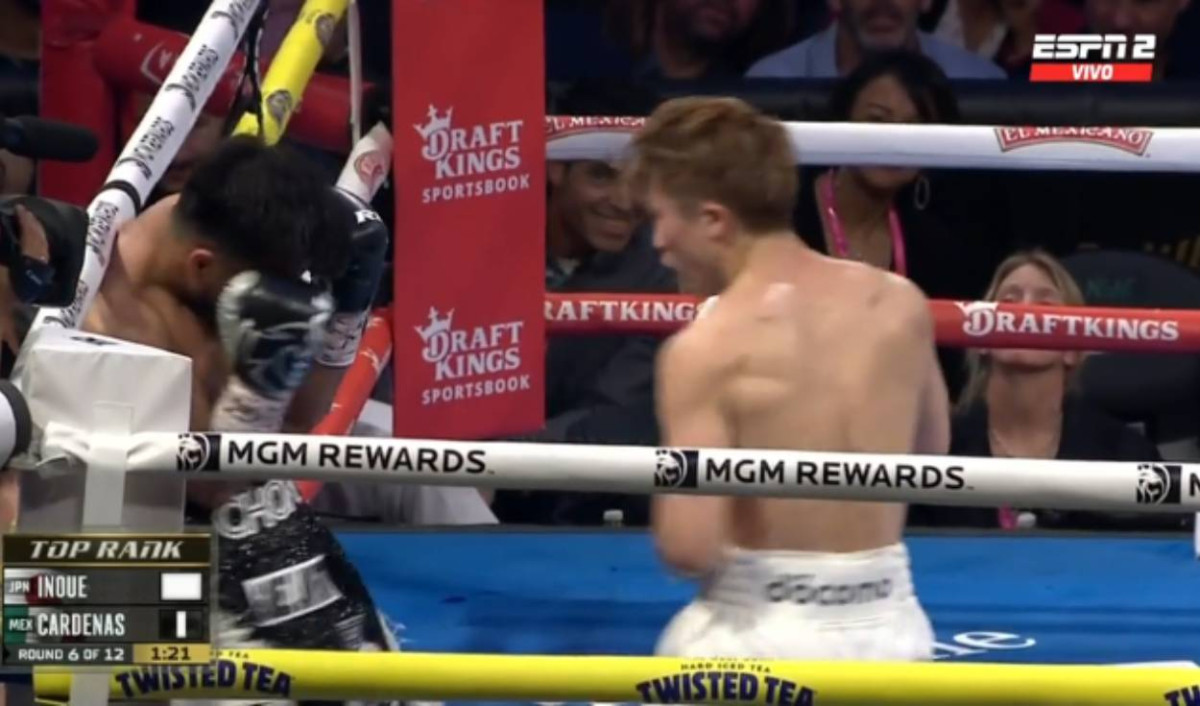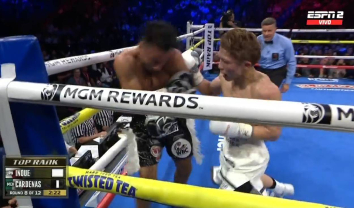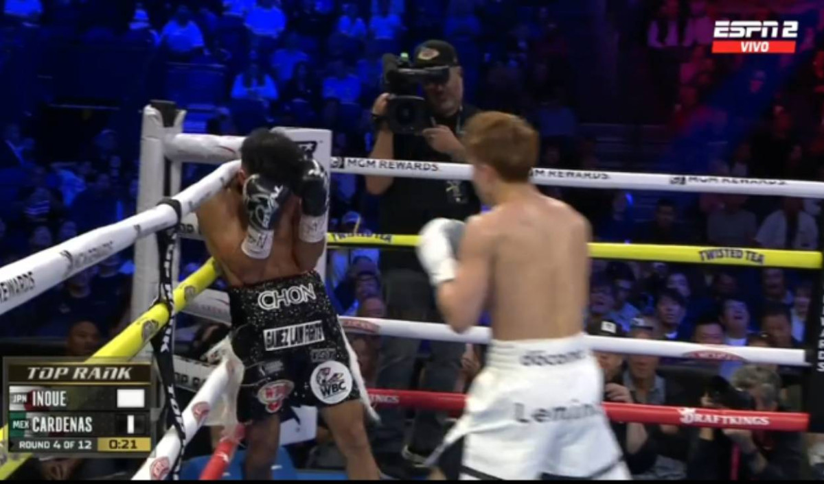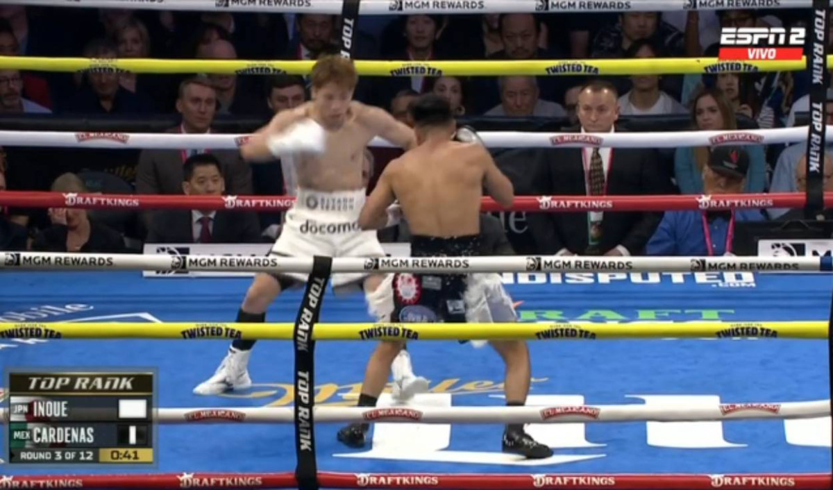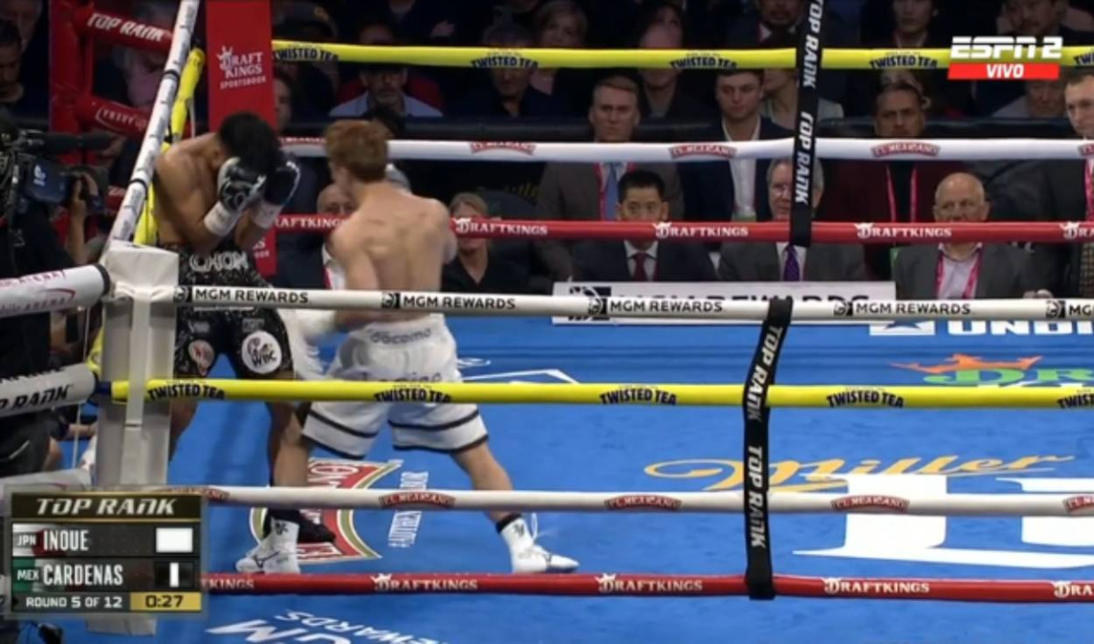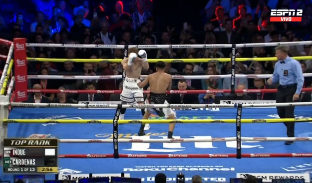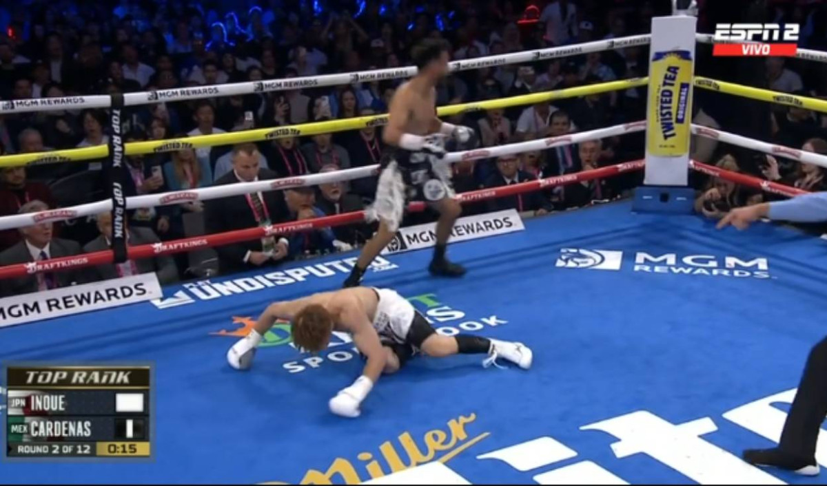 En el segundo round, Cárdenas logra aterrizar buenas combinaciones sobre Inoue y lo llega a dañar. Con un volado de izquierda, el mexicoamericano derriba al Monstruo, quien llega a levantarse. Foto: ESPN