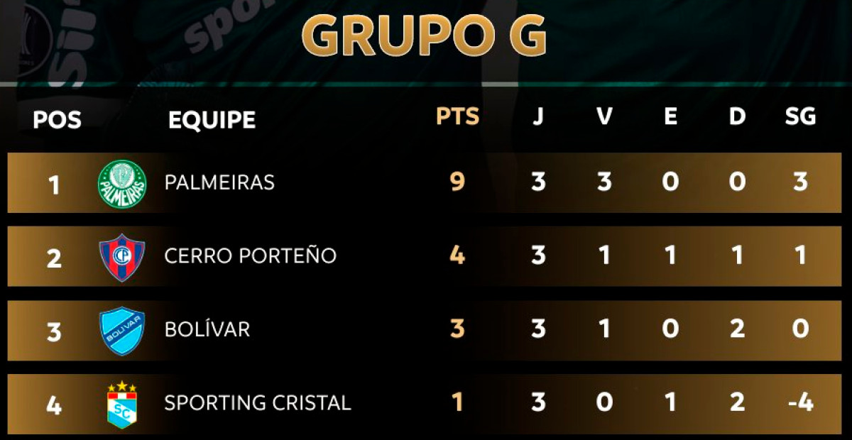 Sporting Cristal se ubica en el último lugar del grupo G con solo 1 punto; sin embargo, una victoria podría permitirle alcanzar el segundo lugar.