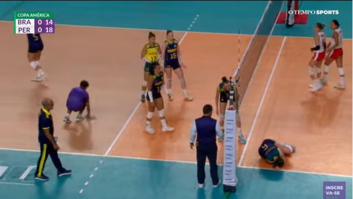 Jacqueline, número 6 de Brasil, se torció el tobillo tras una mala caída. La jugadora tuvo que dejar la cancha. Foto: captura de O TEMPO Sports