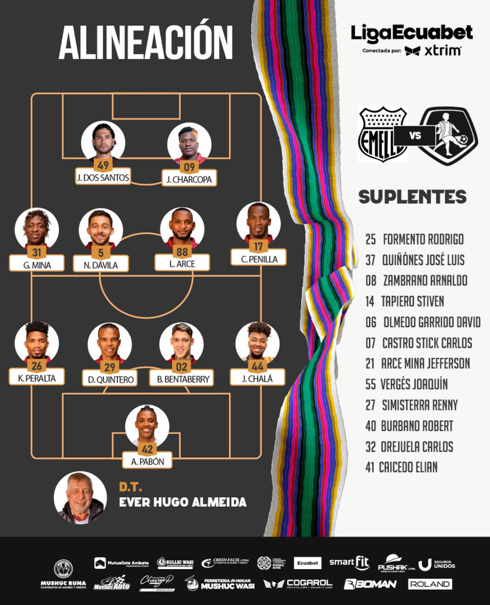 Este sería el equipo titular del Bombillo para el partido: Pedro Ortiz; Romario Caicedo, Diogo Bagüí, Luis Caicedo, Luis Castillo; Marcelo Meli, Alfonso Barco, José Cevallos; Christian Cueva/Alejandro González, Pedro Quiñónez, Facundo Castelli.