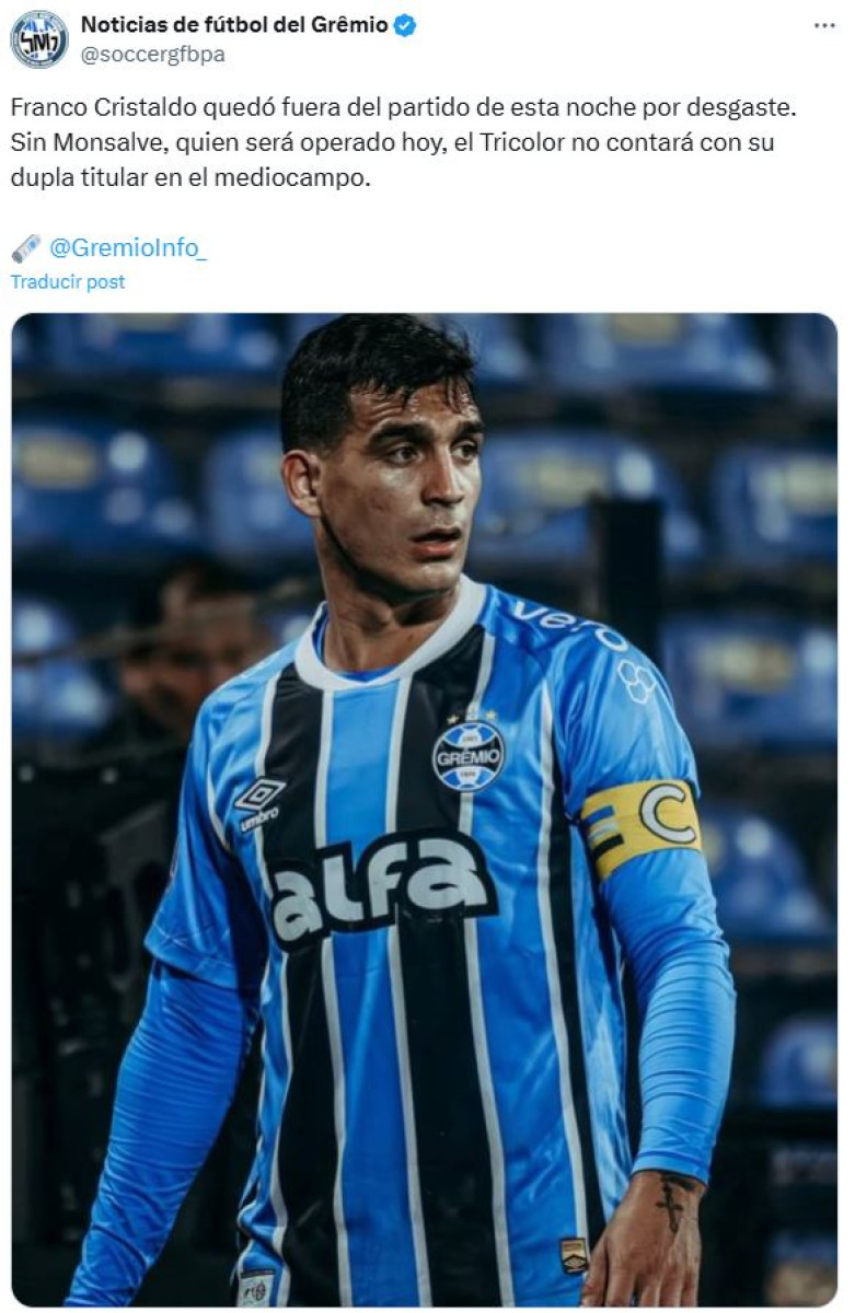 El mediocampista argentino Franco Cristaldo no está convocado para este partido. El jugador era uno de los titulares fijos para Mano Menezes. Foto: captura de X