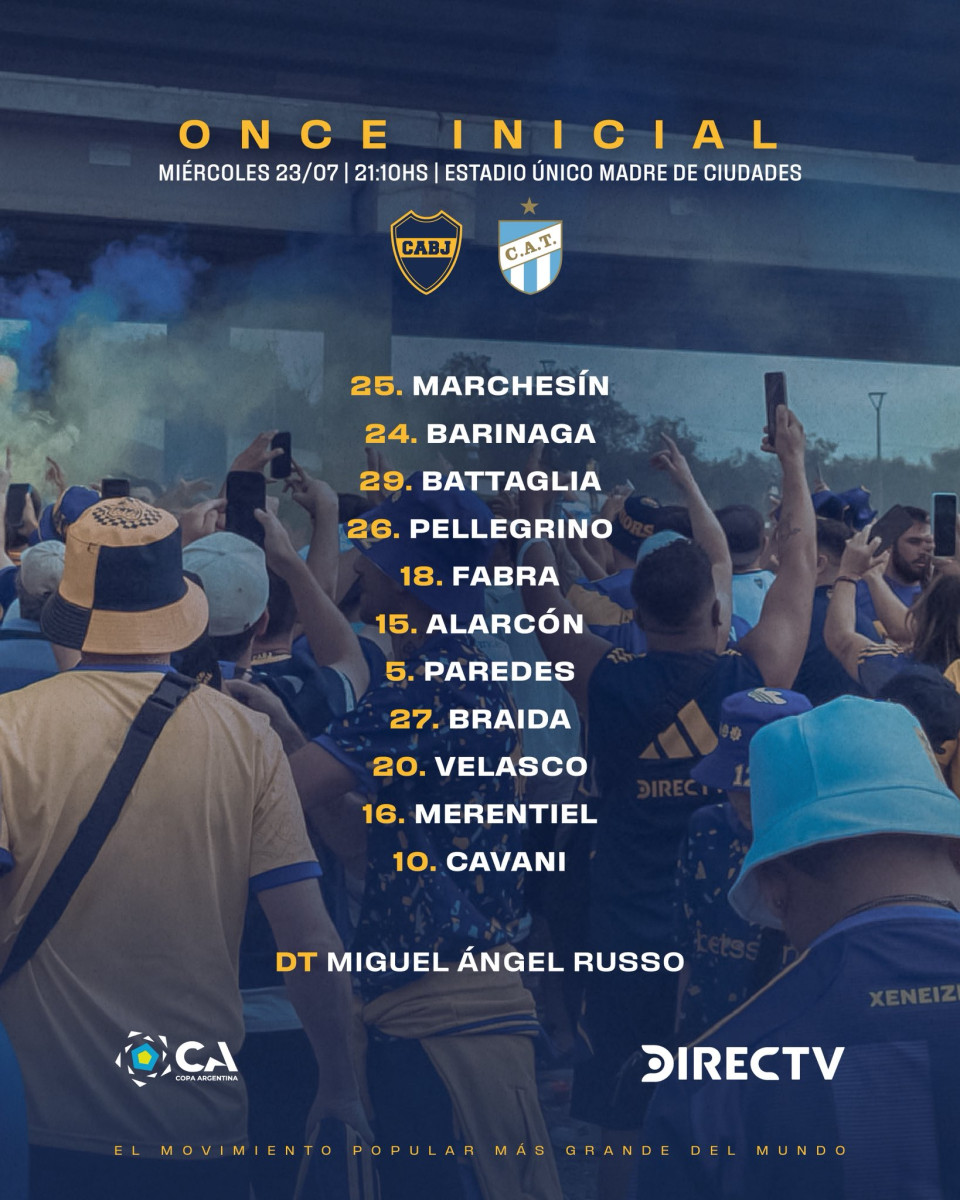 Así saldría Boca Juniors al terreno de juego: Agustín Marchesín; Luis Advíncula o Juan Barinaga, Lautaro Di Lollo o Rodrigo Battaglia, Marco Pellegrino, Lautaro Blanco; Williams Alarcón, Leandro Paredes, Malcom Braida o Milton Delgado, Alan Velasco; Edinson Cavani y Miguel Merentiel.