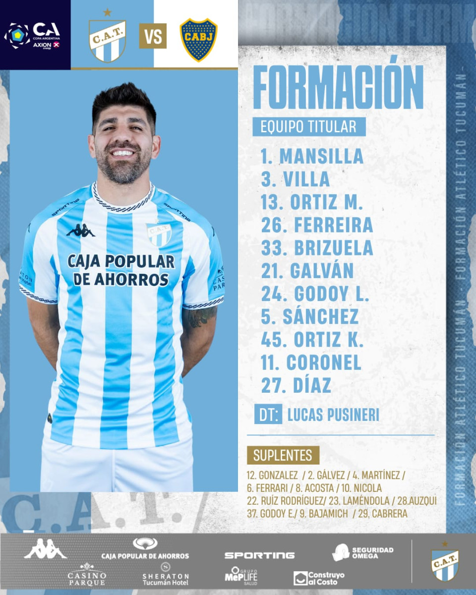 Por su parte, Tucumán saldría al terreno de juego con los siguientes nombres: Matías Mansilla; Damián Martínez, Clever Ferreira, Marcelo Ortíz, Ignacio Galván; Carlos Auzqui, Adrián Sánchez, Kevin Ortíz, Franco Nicola; Mateo Coronel y Leandro Díaz.