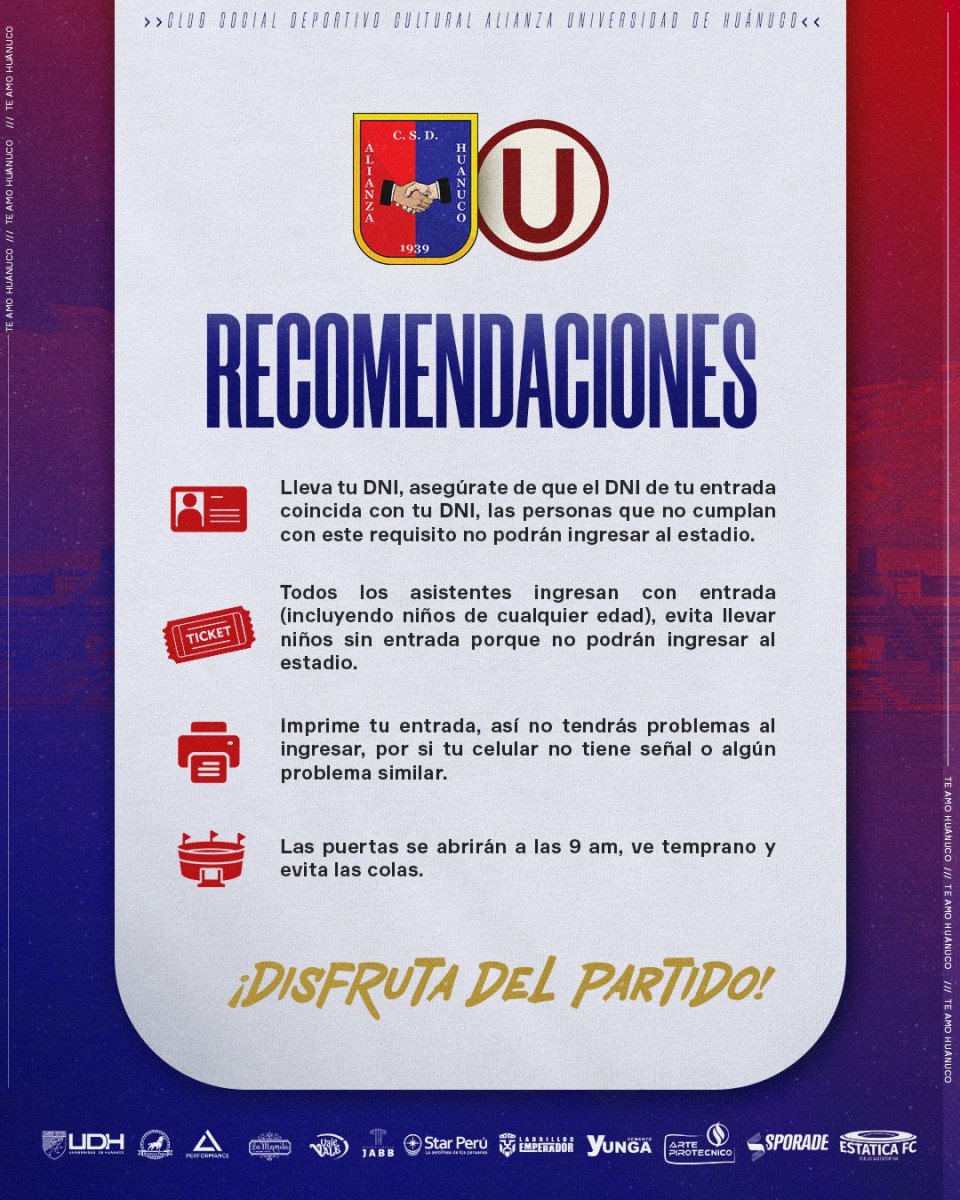 Alianza Huánuco recomiendo a los hinchas que asistan al partido lo siguiente: