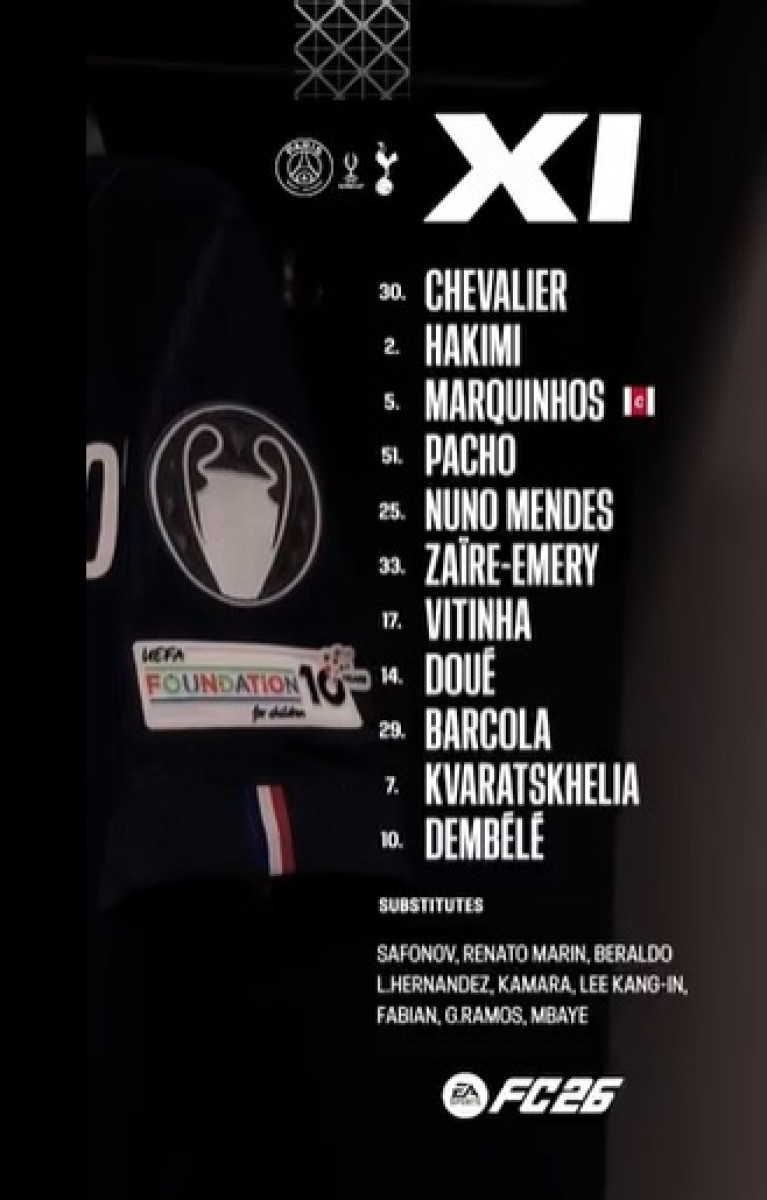 Chevalier; Mendes, Pacho, Marquinhos, Hakimi; Doué, Vitinha, Zaire-Emery; Kvaratskhelia, Dembélé, Barcola. Foto: PSG
