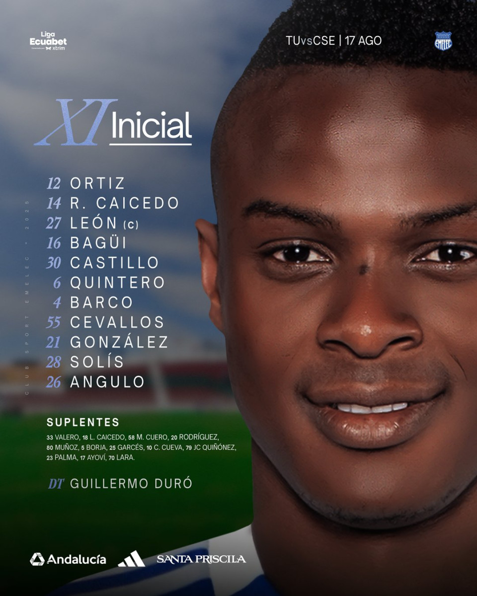 Este sería el once titular de Emelec para su visita a Técnico Universitario: Pedro Ortiz; Luis Castillo, Fernando León, Diogo Bagüí, Luis Caicedo; Sergio Quintero, Alfonso Barco, Alexander González, José Cevallos, Maicon Solís; José Angulo.