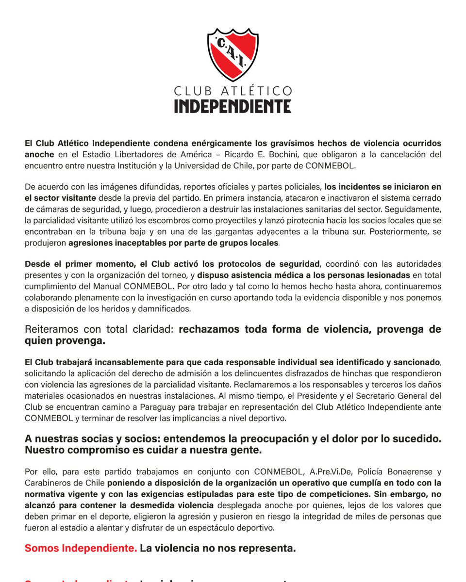 Independiente se pronuncia tras incidentes