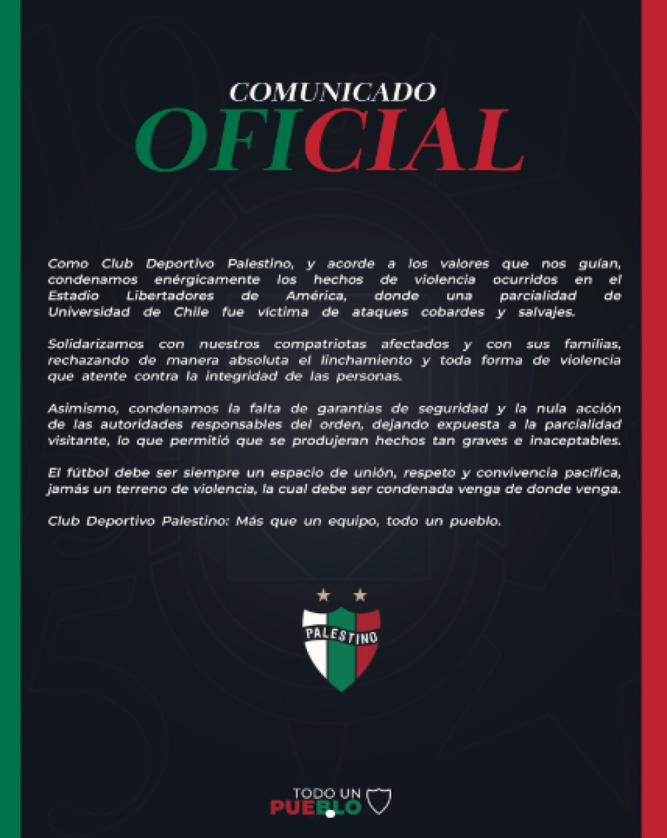 Mediante redes sociales, el club Palestino se emitió un comunicado rechazando los actos violentos en el partido de U. Chile contra Independiente por la Sudamericana.