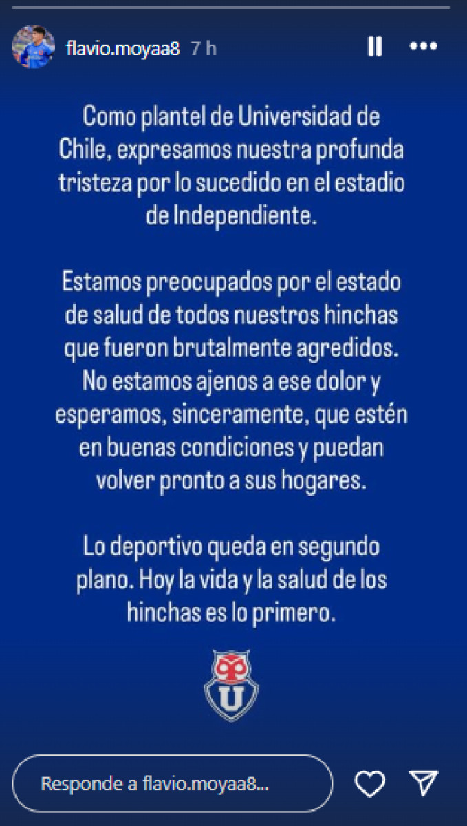 Vía Instagram Flavio Moya, jugador de U. de Chile, se pronunció esperando que los hinchas que estuvieron en el estadio estén en buenas condiciones.