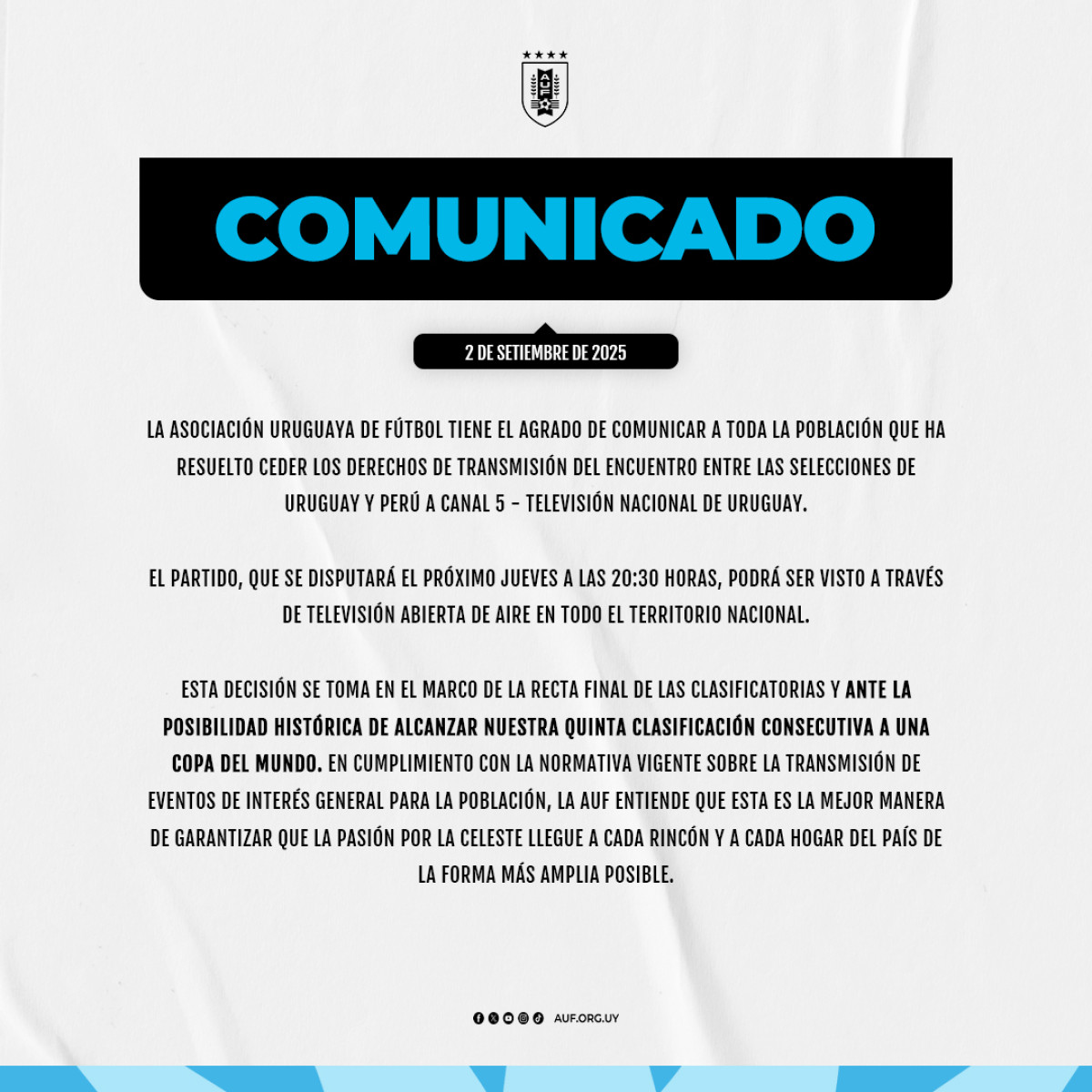 A través de un comunicado, al AUF anunció que el partido entre Uruguay y Perú se podrá ver a través de señal abierta en Canal 5.