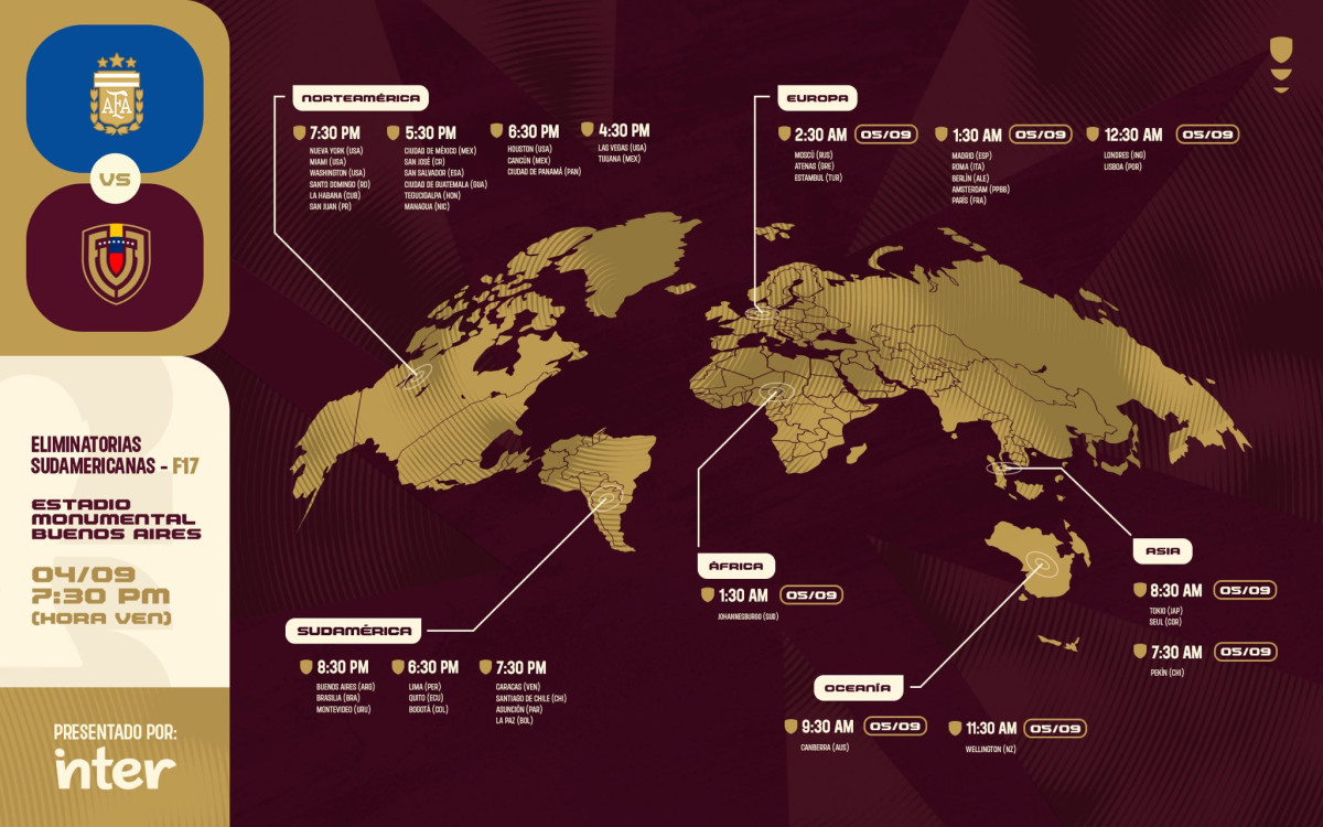El Argentina vs Venezuela por la fecha 17 de las Eliminatorias 2026 está programado para disputarse desde las 6.30 p. m. (hora peruana). Conoce la guía de horarios para otros países: