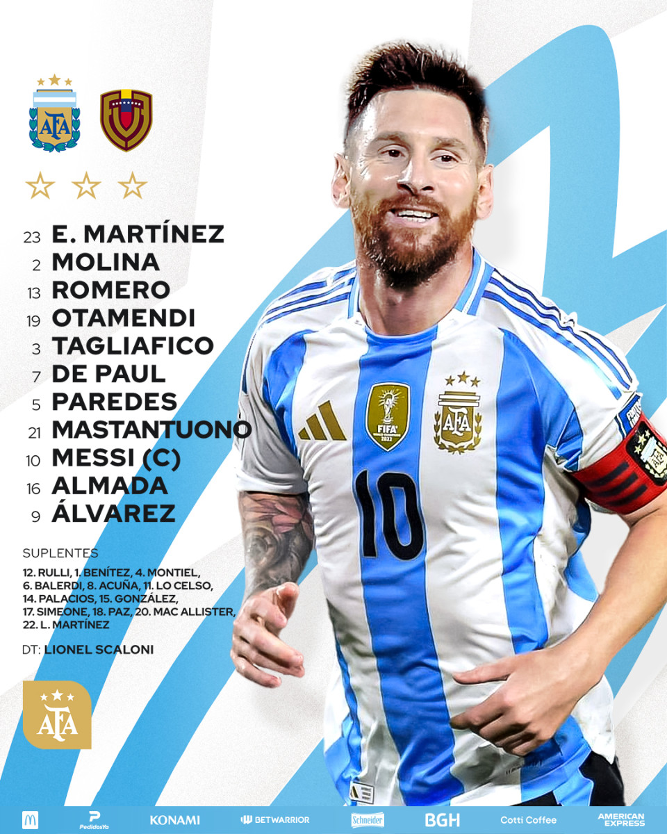 Martínez; Tagliafico, Otamendi, Romero, Molina; Paredes, de Paul; Mastantuono, Almada, Messi; Álvarez. Foto: AFA