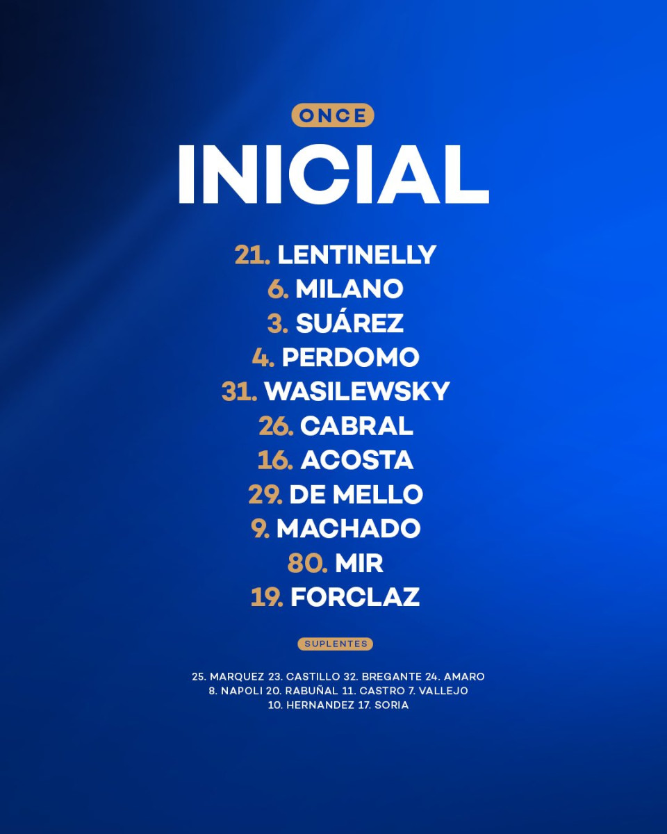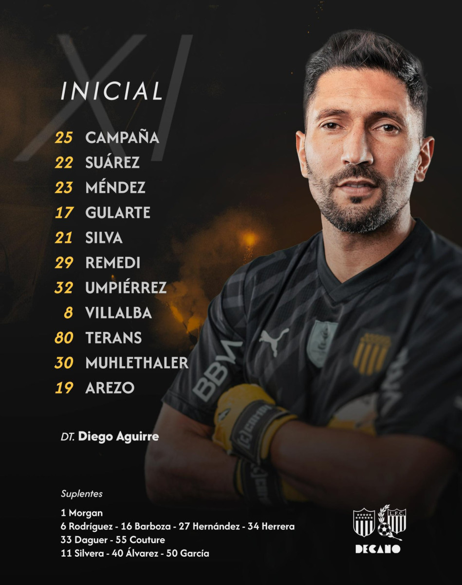 - Peñarol: Martín Campaña; Damián Suárez, Emanuel Gularte, Gastón Silva y Lucas Hernández; Eric Remedi, Lorenzo Couture; Stiven Muhlethaler, David Terans, Leandro Umpiérrez o Brandon Álvarez, y Matías Arezo