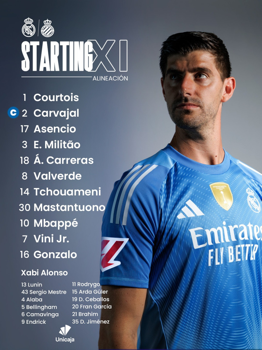 - Real Madrid: Thibaut Courtois; Dani Carvajal, Eder Militâo, Raúl Asencio, Álvaro Carreras; Fede Valverde, Aurelién Tchouaméni, Dani Ceballos, Güler; Kylian Mbappé y Vinicius Jr.