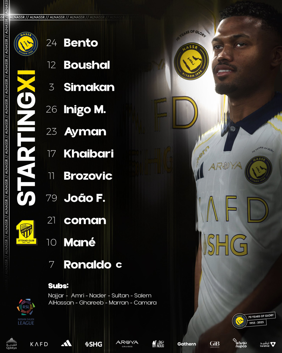 - Al-Nassr: Al-Najjar, Al-Ghannam, Simakan, Martínez, Yahya, Angelo, Brozovic, Mané, Coman, Joao Félix, Ronaldo.