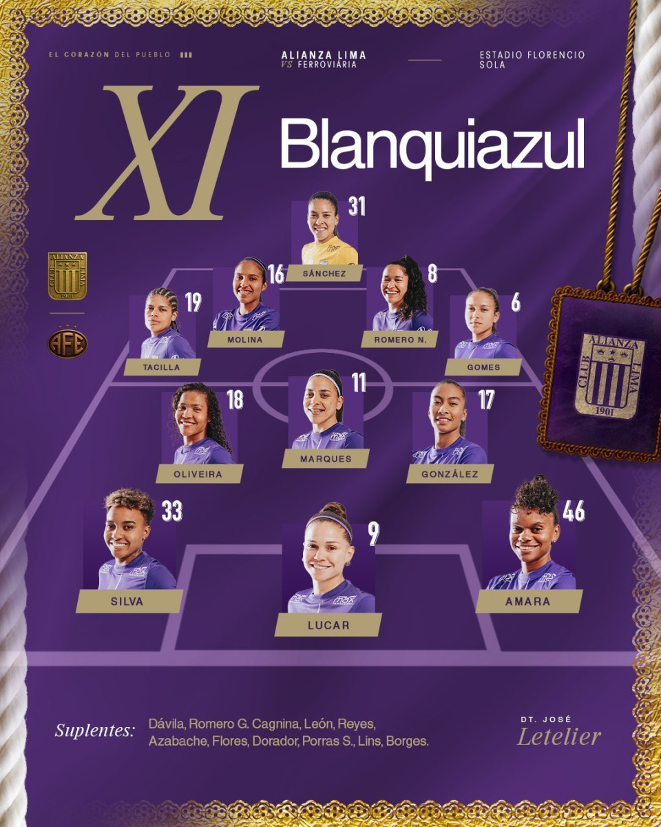 Alianza Lima: Maryory Sánchez; Neidy Romero, Tifani Molina, Kaila Gomes; Estefania González, Silvani Silva, Rafaela Marques, Yomira Tacilla; Annaysa Afonso, Joyse Amara y Adriana Lúcar.