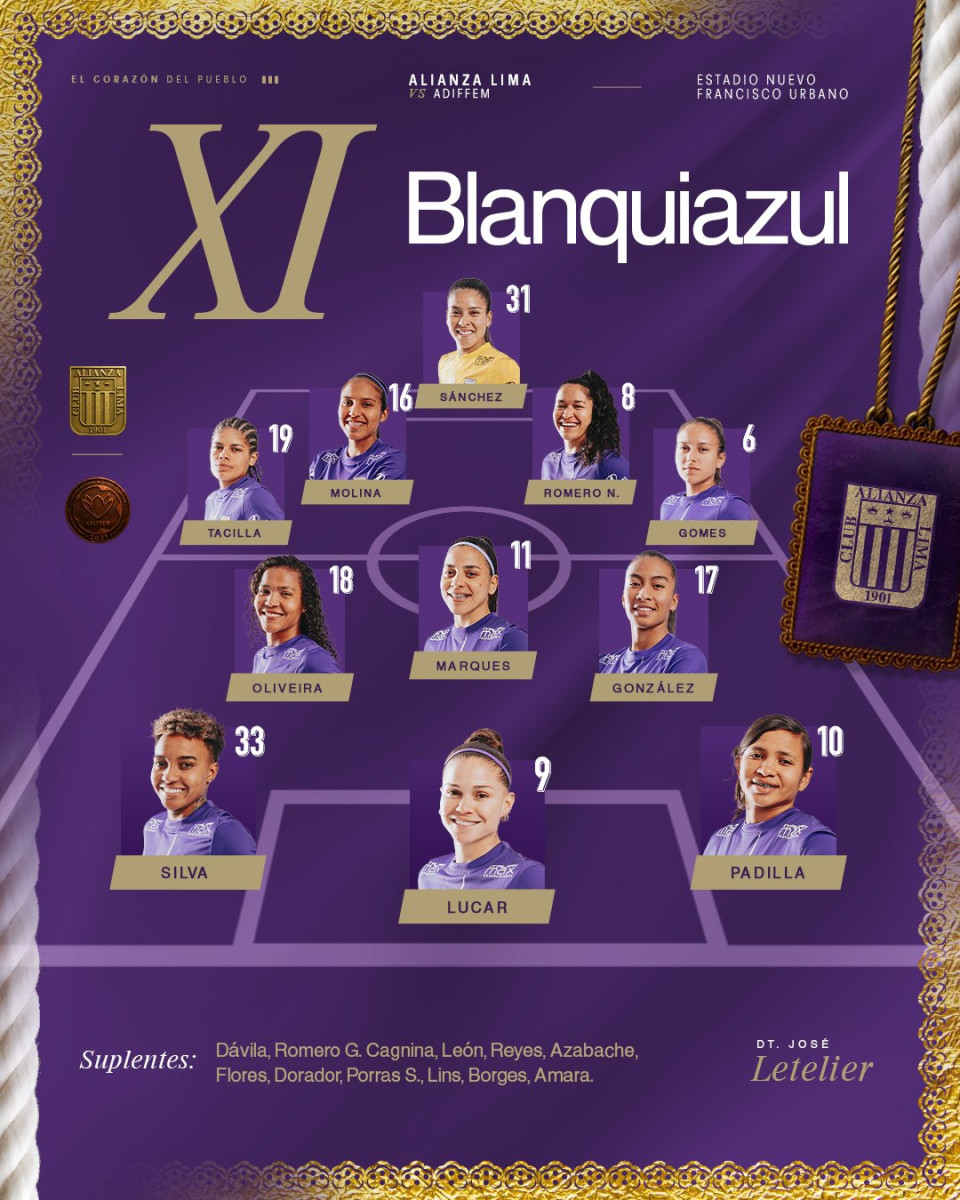 Sánchez, Romero, Molina, Tacilla, Gomes, Annaysa, Silvani, Marques, González, Padilla, Lúcar. Foto: Alianza Lima