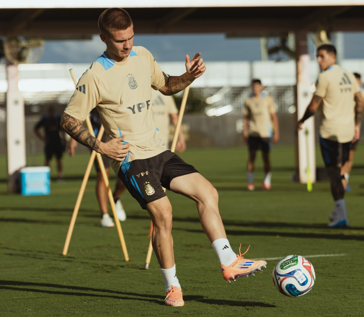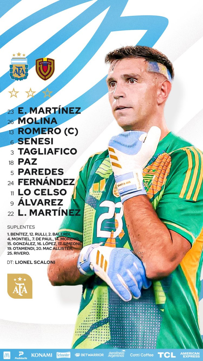 Argentina: Walter Benítez, Nicolás Otamendi, Lautaro Rivero, Nahuel Molina, Marcos Senesi, Leonardo Balerdi, Rodrigo De Paul, Enzo Fernández, Franco Mastantuono, Lionel Messi, Julián Álvarez.