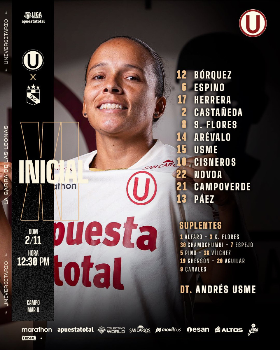 Universitario: Bórquez, Espino, Herrera, Castañeda, S. Flores, Arévalo, Usme, Cisneros, Novoa, Campoverde, Páez