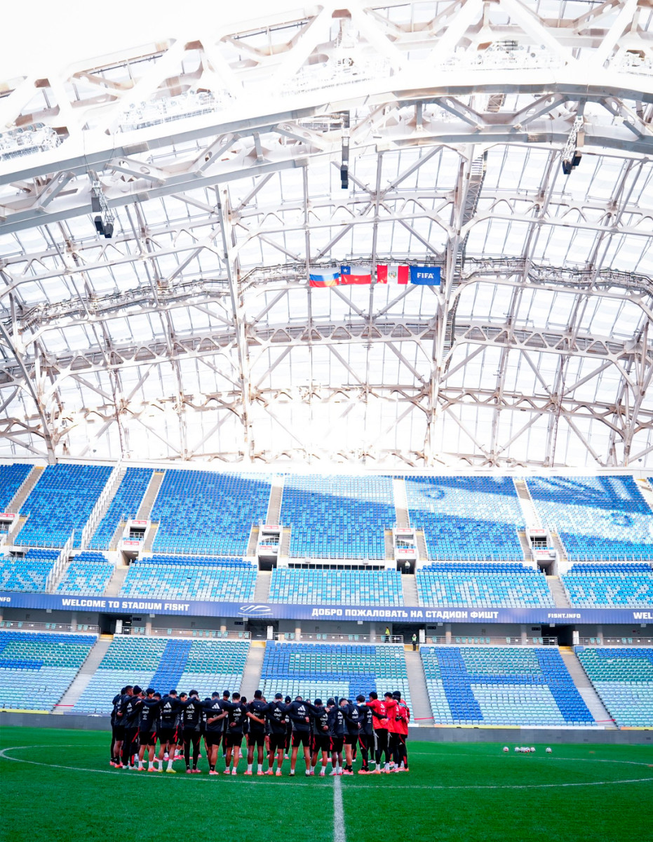 Las selecciones de Perú y Chile se enfrentarán en el Estadio Olímpico Fisht, reciento ubicado en la ciudad de Sochi. La Bicolor realizó el reconocimiento de campo hace un día. Foto: FPF