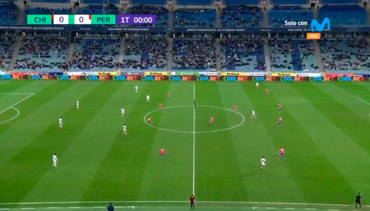 Minuto 74: la selección peruana controla el balón, pero le cuesta generar chances claras en campo chileno.